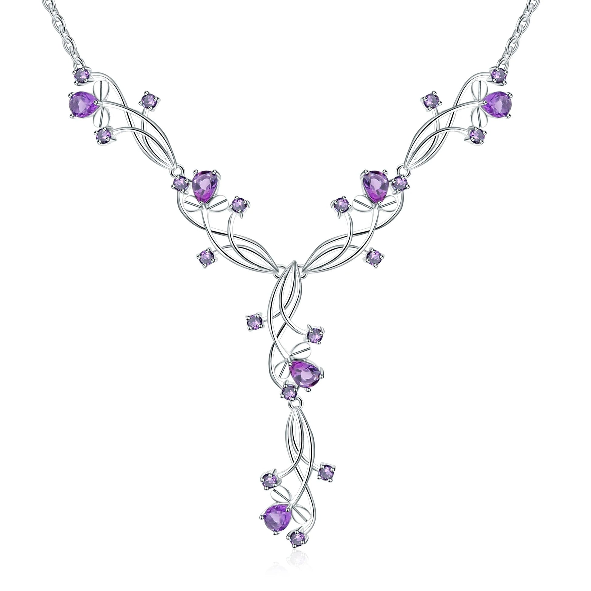 The necklace features a graceful vine of Solid 925 Sterling Silver, blooming with a stunning array of Natural Amethyst gemstones. The total weight of these genuine purple gems is an impressive 6.39 Carats.