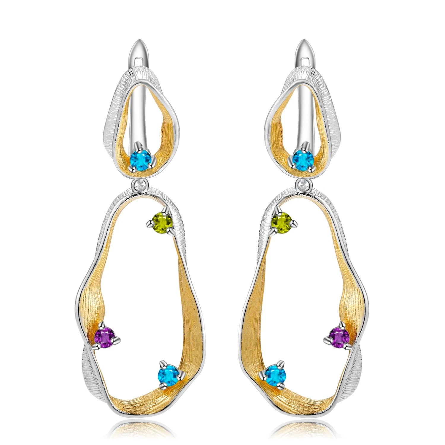 Twisted Abstract Drop Earrings | Amethyst, Peridot & Topaz | Two-Tone Silver