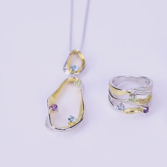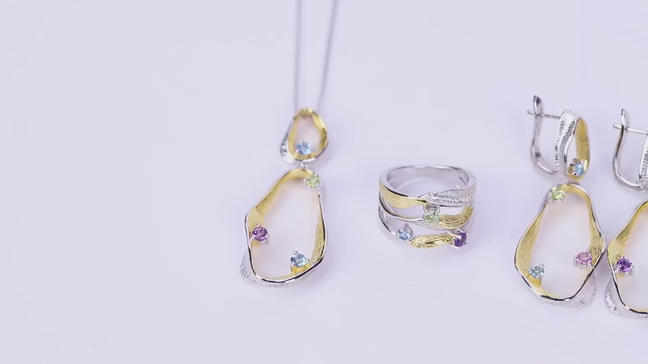 | Gemstones | Natural Swiss Blue Topaz, Peridot, Amethyst |
